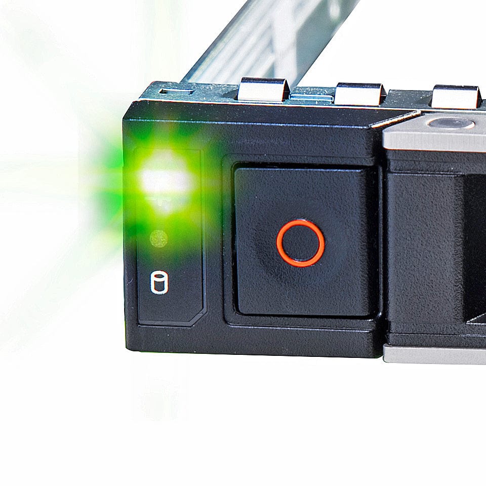 The server backplane has activity LEDs and LED signal lights are transferred special plastic rail to the front of drive caddy. Indicator lights tell important status from the hard drive. Hard drive activity indicator green and hard drive status indicator - green and amber are now cleaner and brighter. (Compared typical aftermarket products)