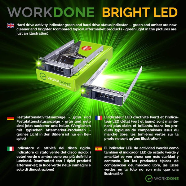 The perfect 2-pack for modern server deployments. Fully compatible with original Dell part numbers WH5D2, 0Y796F, 0X7K8W. Features exclusive WORKDONE Bright LED technology for superior drive monitoring in professional environments. This Dell 3.5 tray is a professional Dell caddy with Dell caddy 3.5 compatibility, featuring Dell caddies design with Dell disk tray, Dell drive caddy, and Dell drive carrier functionality.
